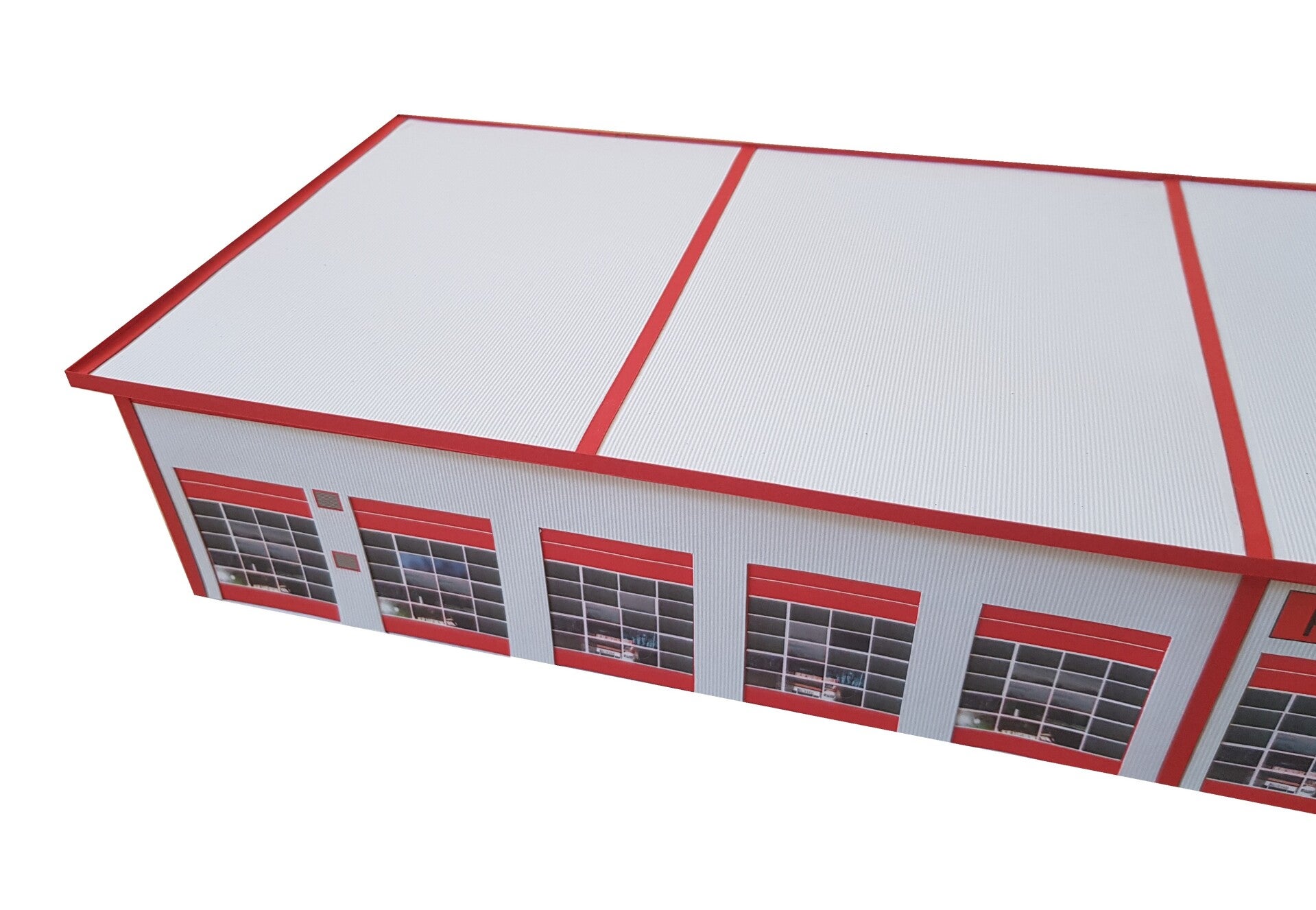 Dieser Bausatz dient zur Erweiterung des Kartonmodellbausatzes "Feuerwehrhaus/Feuerwache HO 1:87". Er erweitert den Bausatz um fünf Rolltore. Ebenso ist das Modell auch einzeln aufstellbar, da die Wand, die an das Feuerwehrhaus angrenzt, ebenfalls gestaltet ist. Es ist keinerlei farbliche Nachbehandlung nötig.