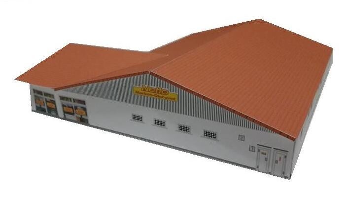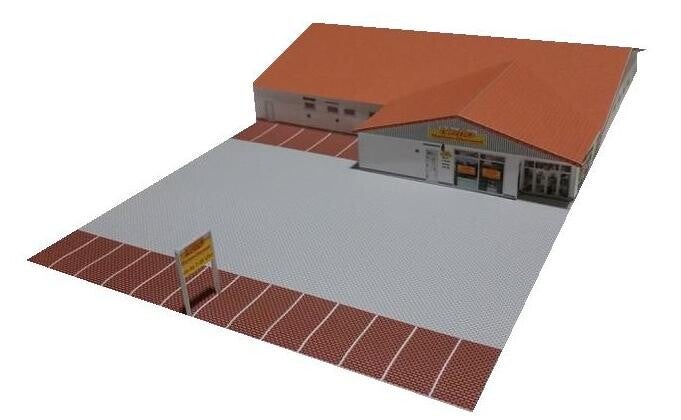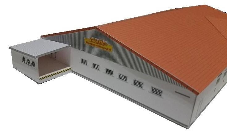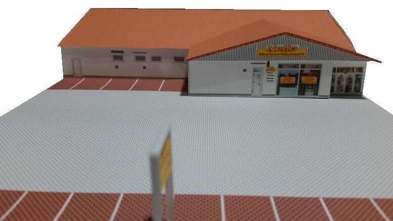 Mit vielen Details wie filigraner Gestaltung des Eingangsbereiches, Anlieferzone, Servicetüren usw. Das Vorbild steht in Köthen/Anhalt in einem Neubaugebiet, wurde mit Genehmigung von Netto Markendiscount ausführlich vermessen und maßstabsgetreu in 1:160 umgesetzt.