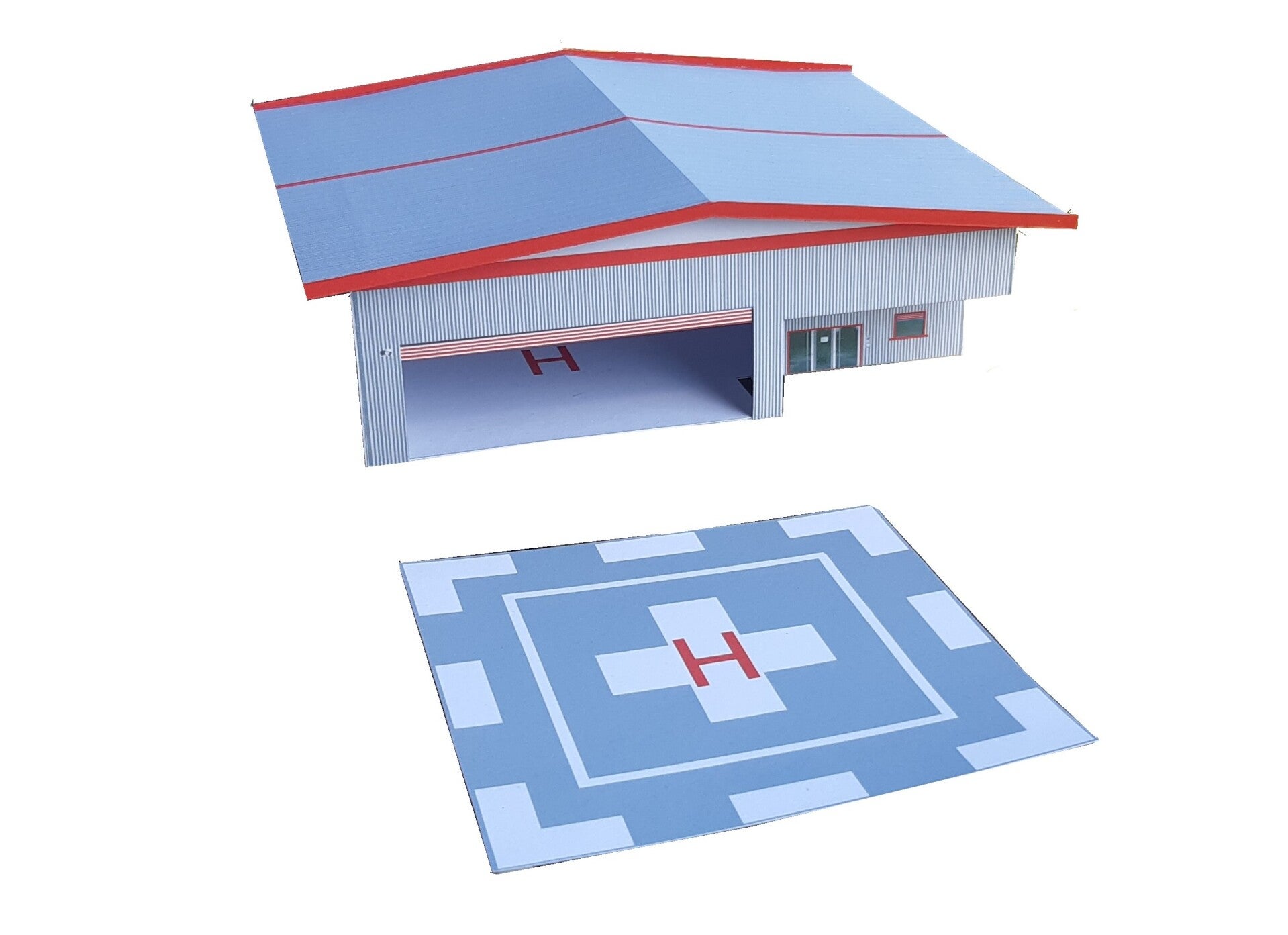 Moderne Helibasis mit Büros und breitem Tor.