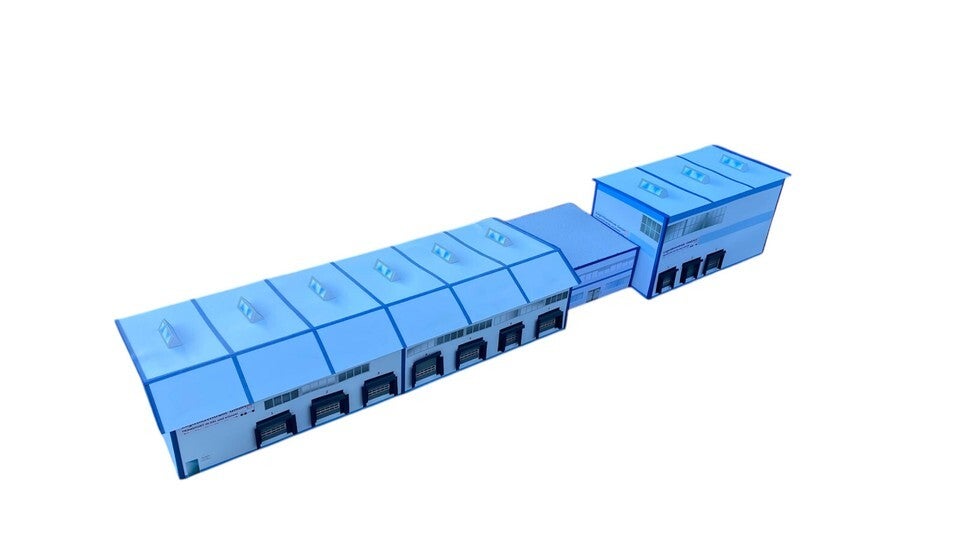Kartonbausatz wie beschrieben für Logistikhalle, Hochregallager und Verwaltung