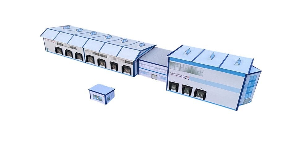 Kartonbausatz wie beschrieben für Logistikhalle, Hochregallager und Verwaltung sowie Pförtnerhaus