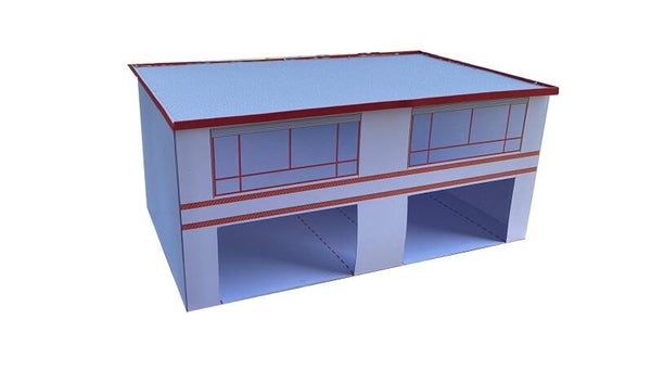 Lieferumfang: Kartonbausatz für Boxengasse-Element mit 2 Toren wie beschrieben und Stickerset.